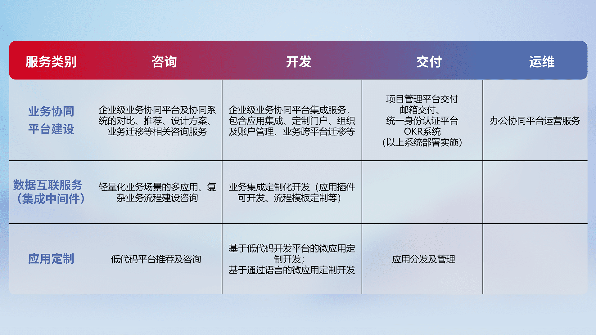 针对钉钉、、、、企微、、、IDaas等平台级产品提供产品的规划、、、、方案、、交付、、、定制化开发等服务,,,实现如统一协同办公、、、智能客户服务、、混合会议管理、、智能数据查询、、、、等业务场景,,,,实现数字化转型。。。。
